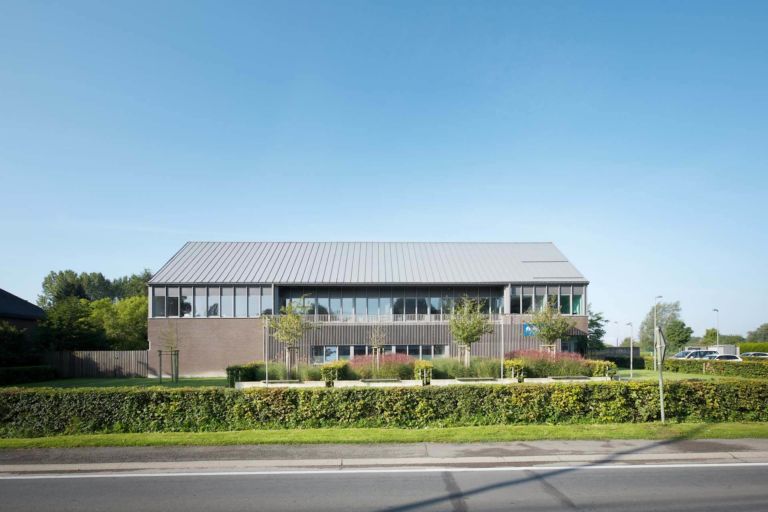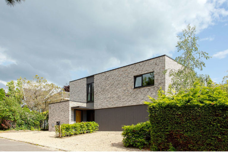 Le premier volume que l’on remarque depuis la rue est l’atelier de menuiserie. Son bardage en bois ajouré est un clin d’œil qui fait écho à l’activité de Frédéric. Visuellement, ce volume semble asseoir tout le reste du bâtiment. Les joues de la partie maison, au rez, laissent apparaître un parement en briques. Et pour finir, la casquette de la maison est un volume en zinc – matériau léger – qui regroupe l’entrée, le cabinet et l’espace de nuit. Les trois matériaux s’accordent bien en restant dans des tonalités similaires.